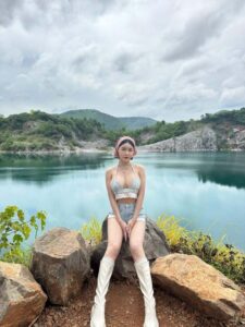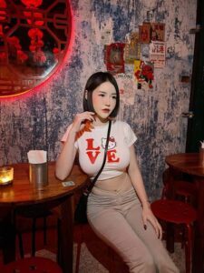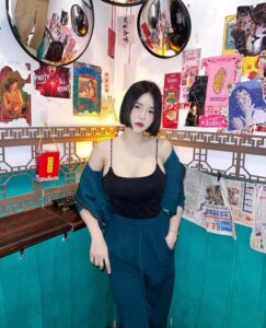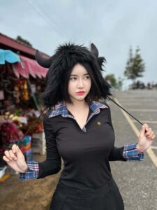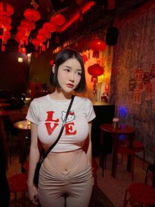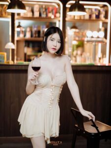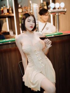 ในร้านธีมจีน น้องก็เลยขอเป็นสาวหมวยเล็กน้อยด้วยการใส่เดรสเกาะอกสีขาว เปิดไหล่ เปิดเนินอกให้เห็นความเนียน และ ทรงขนาดที่ไม่ธรรมดา ไม่เท่านั้นท่อนล่างที่เน้นสะโพกก็สวยไม่แพ้ใครเหมือนกันให้ฟีลน้องหมวยขายของแถวบ้านที่ขาวมากน่ามองมาก จากลุคนี้เปลี่ยนแบบเป็นคนละคนด้วยงาน ถ่ายแบบ ชุดนี้ที่เป็นเดรสหนังสีดำเกาะอก เปลี่ยนสีผมเป็นสีเทาให้ฟีลเหมือนกับ