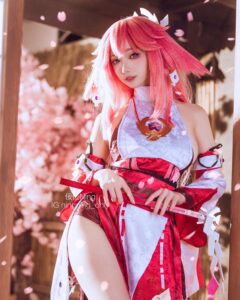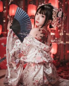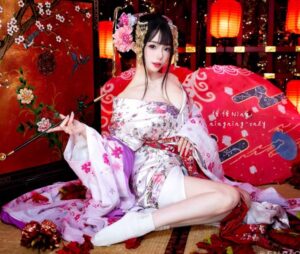 เราเข้าไปเจออันนี้เหมือนโดนตกเลย งาน ถ่ายแบบ คอสเพลย์ ในธีมสาวหอนางโลมแดง ต้องยอมรับว่าสวยมาก มาด้วยกิโมโนลายดอกไม้สีแดง เปิดไหล่ขาวเนียน หน้าสวยขาว มาพร้อมกับเครื่องสูบยาตัวยาว ดูเซ็กซี่