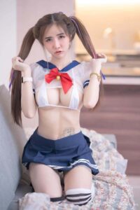 ที่ขอเป็น สาว ม.ปลาย ญี่ปุ่น แบบเซลเลอร์มูน ด้วยเสื้อสีขาวตัวเล็ก ผ้าโปร่งจนเห็นเนื้อใส กับ บราสีขาวที่บีบตรงปลายจนเล็กปิดจุกเท่านั้นเอง กระโปรงสีน้ำเงิน ลุคนี้แค่นี้คือจบเลย ได้ฟีล สาว ม. ปลายญี่ปุ่น มาแต่ง